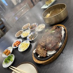 Korean restaurant, located in a plaza that provides parking. Downstairs for non grillers and upstairs for those who want to grill. We did the $29 angus menu as I cannot eat as I used to anymore and my favorite is the short rib only. It's not bad for the price obviously. There's a handful of banchan they provide. There's also an appetizer and sides selection menu. In addition to the grilled meats we got steamed egg, edamame, poke salad, chicken wings, and the soup. The poke salad came with small diced salmon and tuna, color wasn't too good and too much dressing. The chicken wing was definitely made to order but lacked taste. Soup was good and pretty big so it'll fill you up, so be careful. On one side there's a self serve station for you to choose additional vegetables to grill. They also have different marinated chicken, shrimp and octopus in the self serve station. Rice is also self serve. Service was good, severs were attentive to checking in on us and switching out our grill plate. Not bad for the price. Their ventilation system as my husband pointed out must be good because our coats didn't smell after we were done.